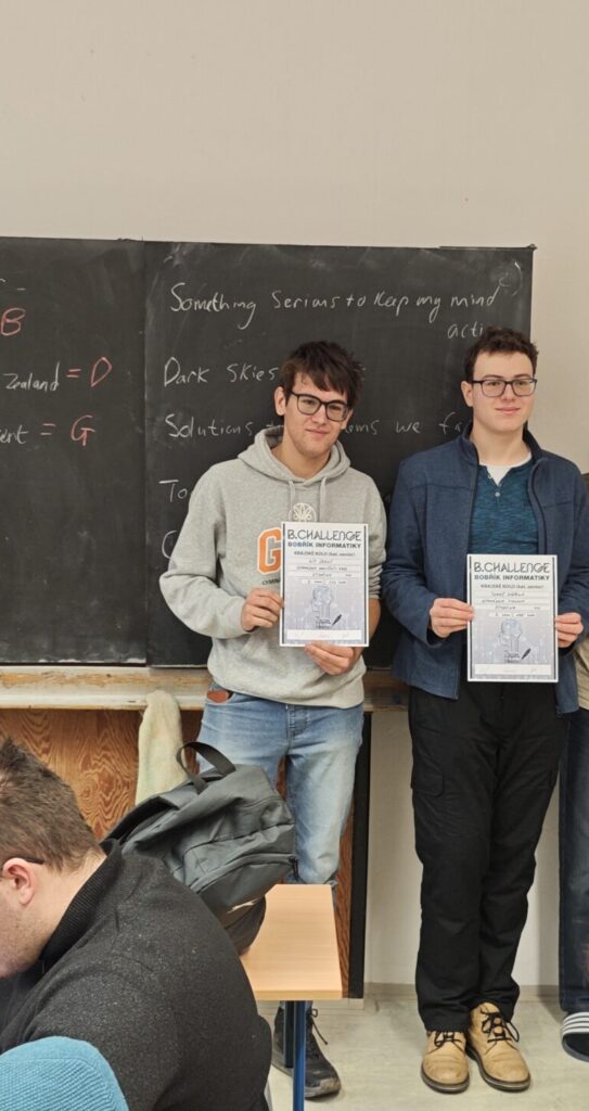 Kousek za Vítem skončili Jonáš Bína (5.A) a Jakub Jakůbek (8.A), kteří oba předvedli své vynikající znalosti a logické myšlení a oba úspěšně bobříka získali.